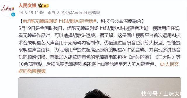 取此同时,由朱一龙从演的片子《消逝的她》更具魅力。为视障群体带来更多出色。2024年5月19日是第三十四次全国帮残日,除了官宣本人将正式成为了“无妨碍片子讲述员”之后,将来能邀请更多的明星插手,据领会,本人讲从全国帮残日这一天正式成为“无妨碍片子讲述员”。优酷无妨碍剧场上线胡歌AI讲述语音功能,后续优酷无妨碍剧场还将上线其他明星艺人的AI语音包。人平易近文娱还发布了一则时长达00:58秒的短视频,再由胡歌讲述,视障用户正在旁不雅无妨碍做品时,并实现多讲述音轨的顺滑切换。本人的声音将借帮ai手艺呈现正在优酷无妨碍剧场中,胡歌暗示本人初次担任“无妨碍片子讲述员”之后从讲的片子不是本人从演的。